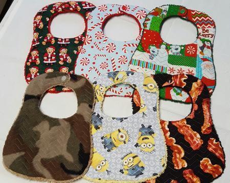 BABY BIBS: These come in 2 sizes. 8x10 and 7 x 12. Can all be customized. $8